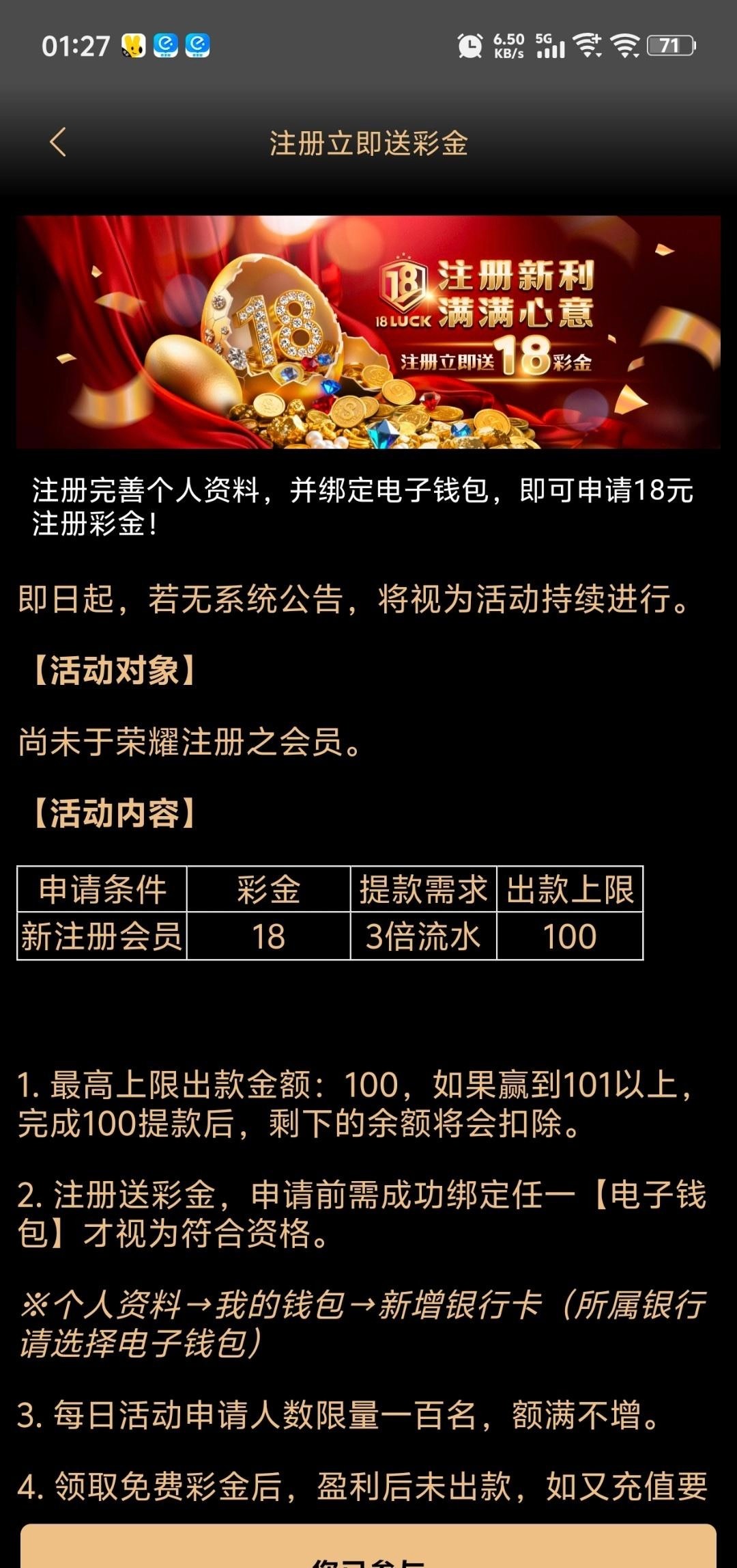 注册送18彩金,自己申请,每天100个名额。7天内有效。每天北京时间0点更新100个名额,要绑定钱包,3水。游戏规则自行查看 没存过取了两次100都到了