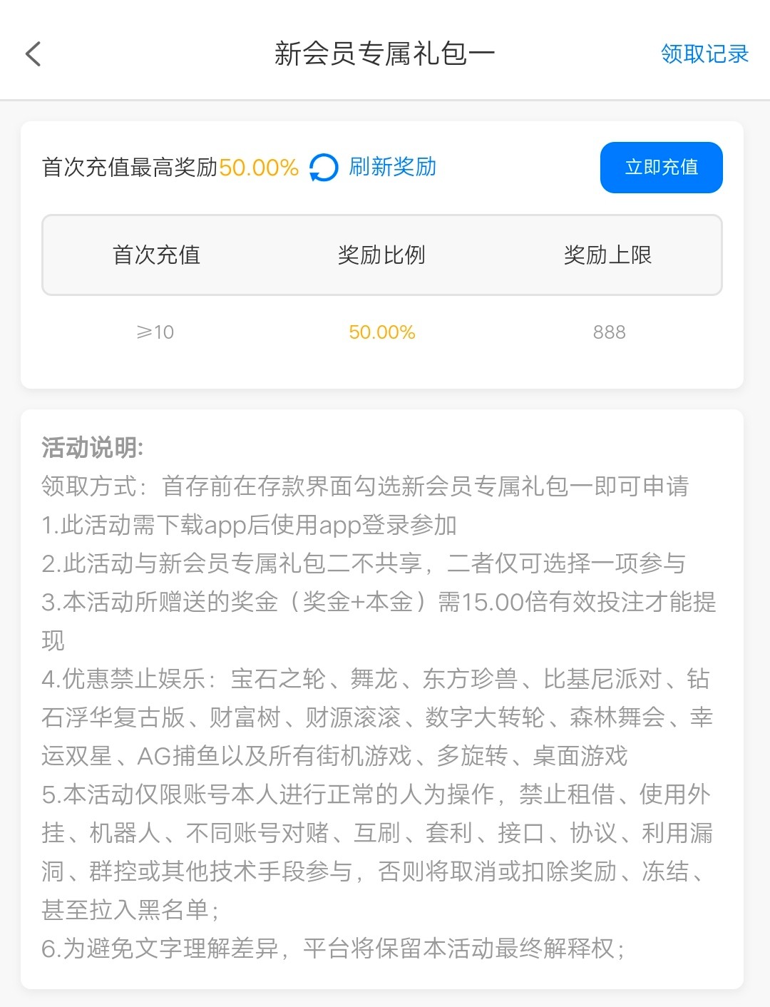 新用户注册下载,活动专区自助申请碰瓷特邀福利,申请不到无视就好,新会员首存送50%(充值时勾选新会员专属礼包一),具体规则看活动介绍,提款完成任务送18彩金。